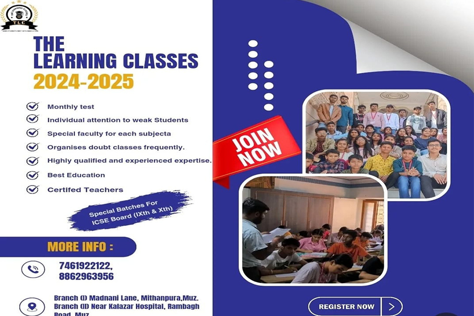 द लर्निंग क्लासेस में हमसे जुड़ें और एक परिवर्तनकारी शैक्षिक यात्रा का अनुभव करें। हम मिलकर आपकी क्षमता को उजागर करेंगे और एक सफल शैक्षणिक और पेशेवर कैरियर का मार्ग प्रशस्त करेंगे।